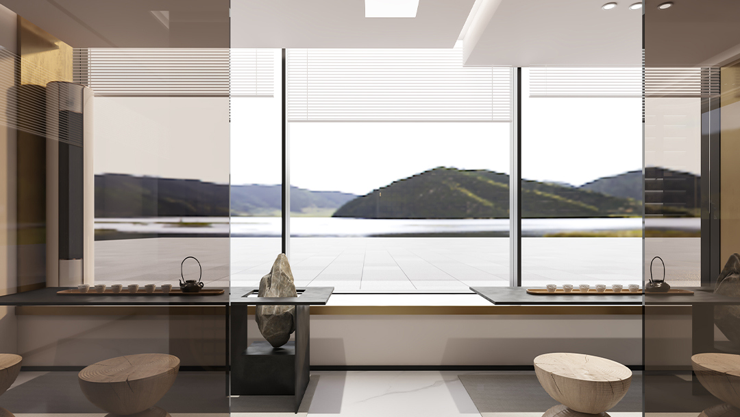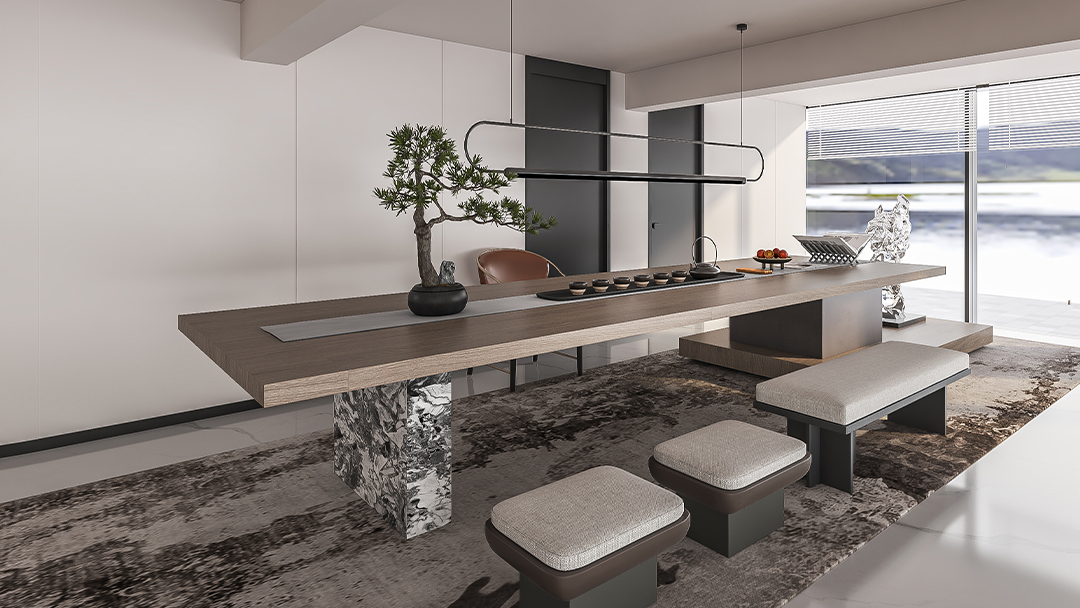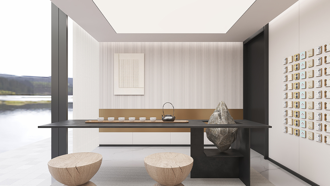 采用無主燈設(shè)計(jì)結(jié)合智能調(diào)光系統(tǒng),通過磁吸軌道燈與隱藏式燈帶營造多場景氛圍;開放式茶臺(tái)區(qū)以線性照明強(qiáng)化操作臺(tái)面實(shí)用性,私密包廂則利用夾絹玻璃移門實(shí)現(xiàn)光線柔和過渡,兼顧社交互動(dòng)與靜謐獨(dú)處需求。