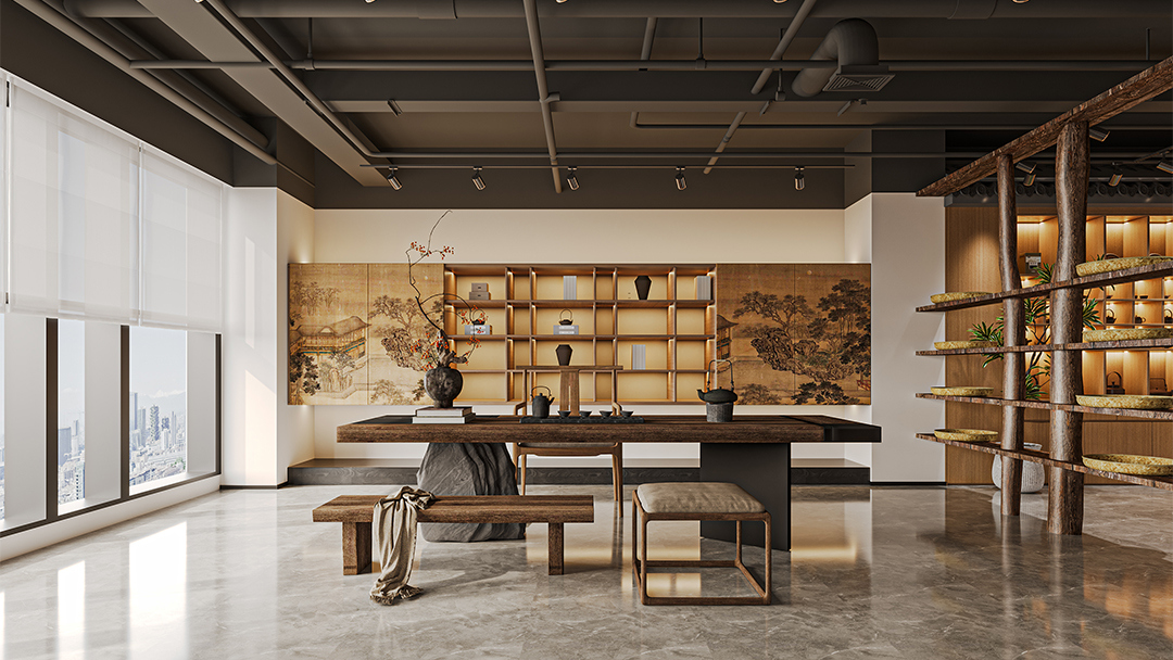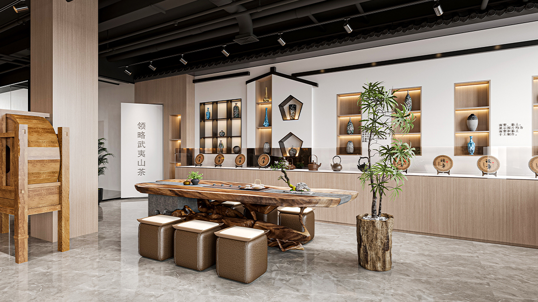 設(shè)置開(kāi)放式點(diǎn)茶區(qū)、私密包廂及景觀庭院,例如大廳以抬高地臺(tái)劃分主客位序,包間融入榻榻米茶席與獨(dú)立枯山水造景,動(dòng)線設(shè)計(jì)參考《清明上河圖》的街巷邏輯,引導(dǎo)顧客沉浸式體驗(yàn)宋人雅集。