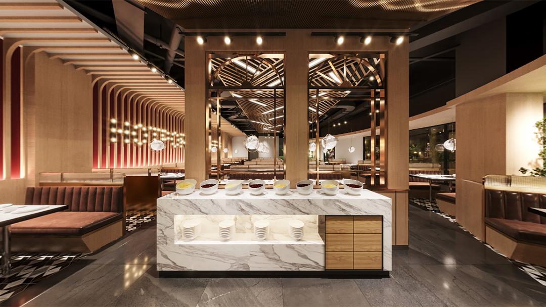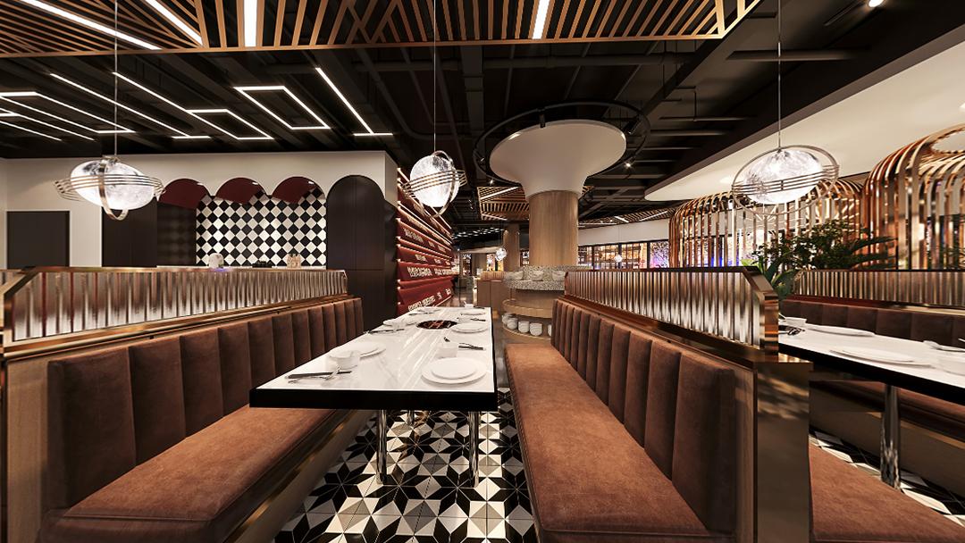 針對一人食小火鍋的私密性與社交需求,博妍采用 “沉浸式單人餐位+輕社交模塊” 組合設(shè)計(jì):通過暖黃燈光、木質(zhì)隔斷與綠植造景營造溫馨氛圍;設(shè)置獨(dú)立吧臺或卡座,搭配可調(diào)節(jié)隔板靈活劃分空間;選用防火耐磨的仿古地磚、易清潔墻面涂料,兼顧實(shí)用性與安全性