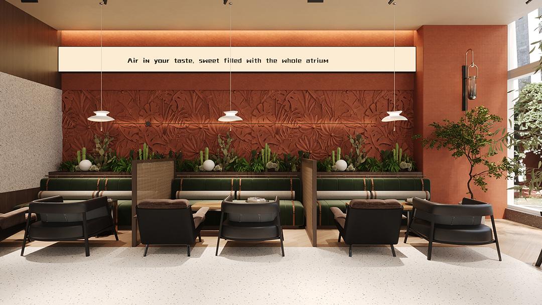 精選進(jìn)口石材、實(shí)木飾面等高端材料,搭配手工定制的藝術(shù)裝置,如金屬鏤空屏風(fēng)等,凸顯品牌的精致格調(diào)。