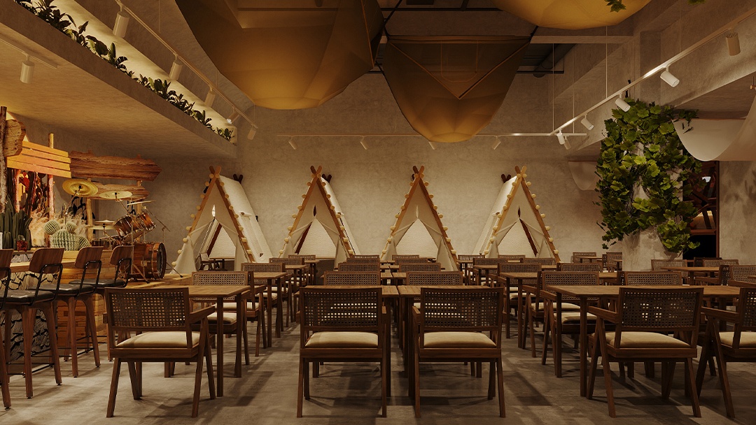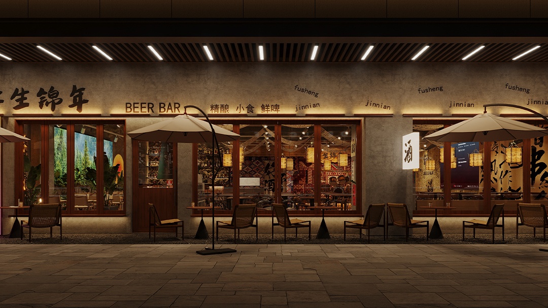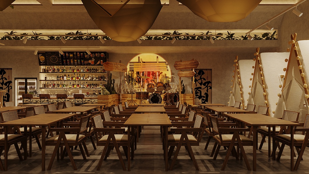 杭州露營風(fēng)戶外酒吧裝修設(shè)計(jì),本案以“都市曠野聚落”為概念,將山系美學(xué)植入城市夜生活??臻g鋪陳礫石地與仿真草坪,搭配復(fù)古煤油燈串與天幕系統(tǒng)。中心區(qū)域架設(shè)篝火裝置與折疊椅環(huán)座,吧臺(tái)由改裝露營車箱體構(gòu)成。墻面運(yùn)用防銹鋼板與回收木料,嵌入戶外裝備展示架與多功能電源接口。頂部懸掛星空投影網(wǎng),結(jié)合隱藏式取暖設(shè)備與驅(qū)蚊系統(tǒng),營造全天候可用的沉浸式戶外社交場(chǎng)景。