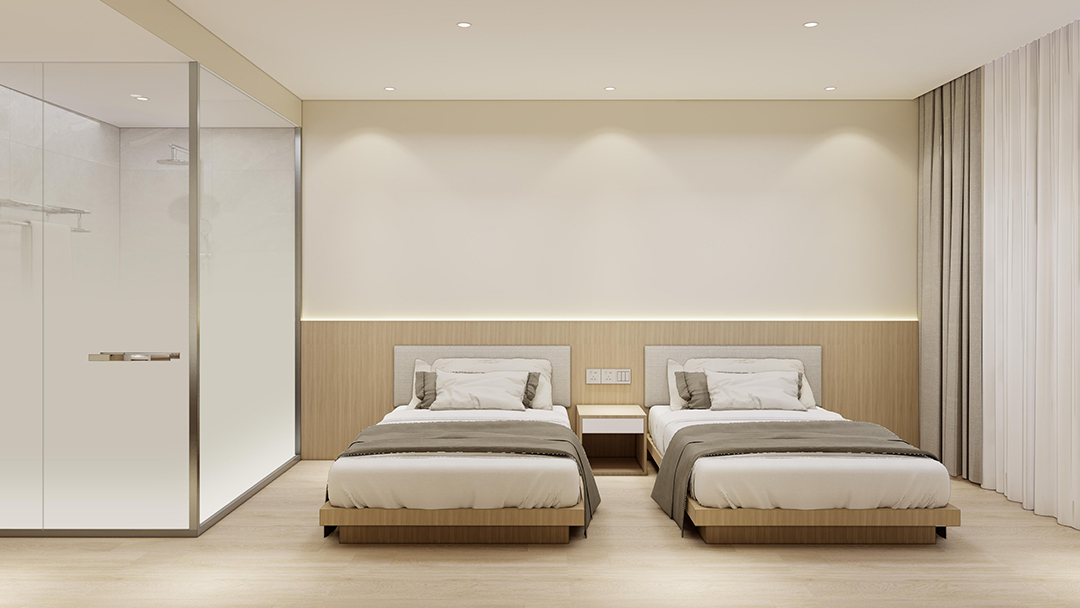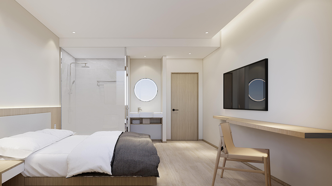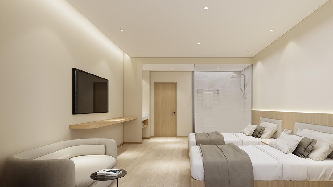 杭州極簡風(fēng)酒店裝修設(shè)計(jì),以極簡與輕工業(yè)風(fēng)為設(shè)計(jì)核心,采用天然褐色原木與灰色砌磚營造質(zhì)樸氛圍,外立面大面積落地玻璃引入自然光,實(shí)現(xiàn)古樸與現(xiàn)代的交融。室內(nèi)以幾何線條分割功能區(qū),如鏡面玻璃走廊延伸空間感;客房內(nèi)暖黃原木與冷灰淋浴玻璃形成視覺對比,頂樓保留裸露木質(zhì)屋頂,搭配鋼結(jié)構(gòu)閣樓提升實(shí)用性,盡顯極簡設(shè)計(jì)中的精致巧思。