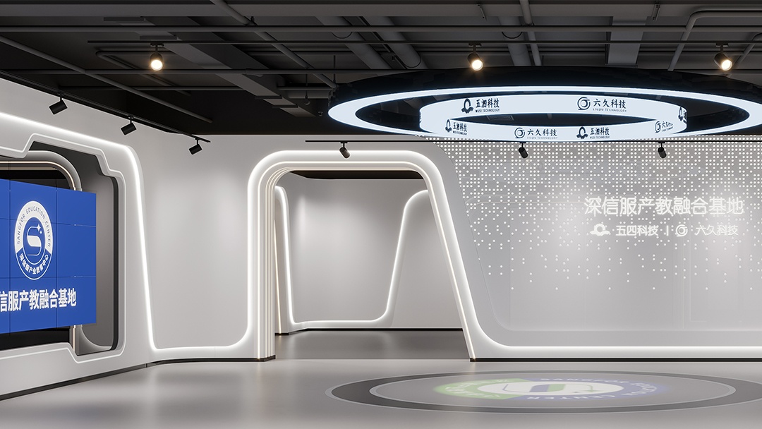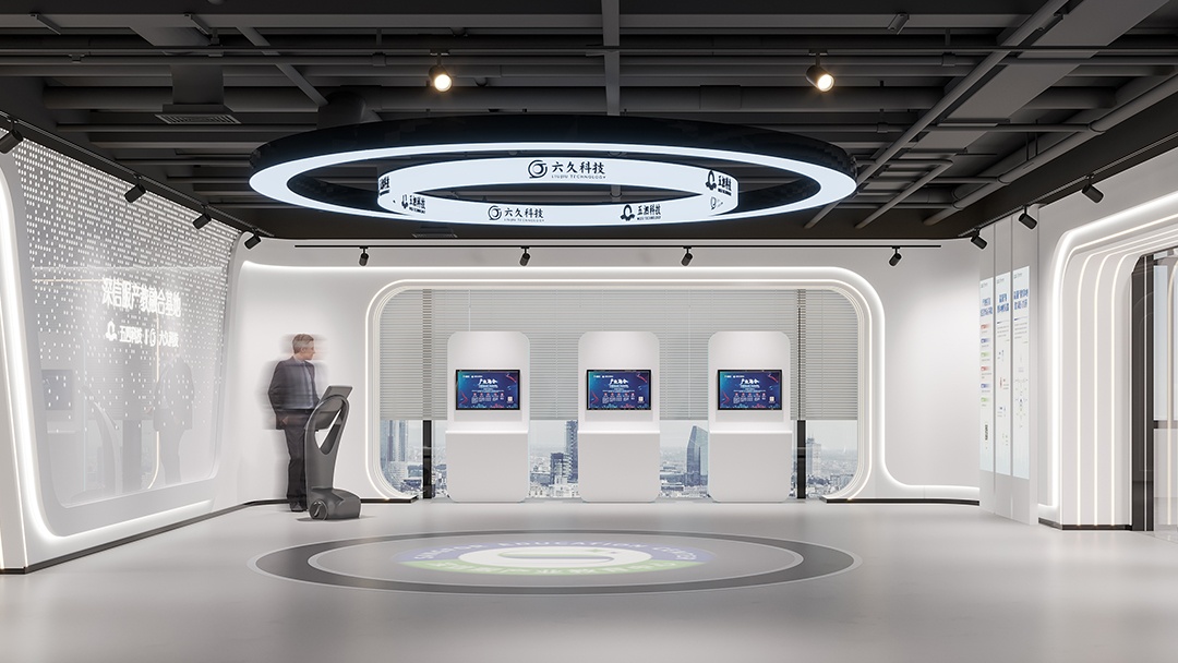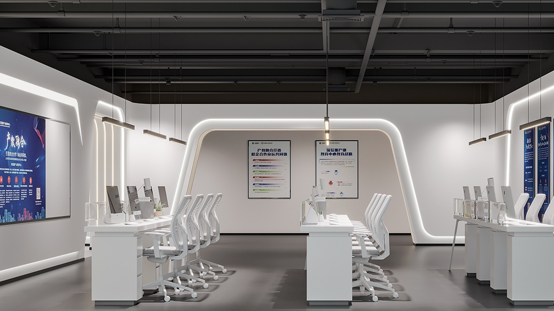 杭州科技展廳裝修設(shè)計,以簡潔白為主色調(diào),開啟一場科技與美學(xué)的對話。純凈的白色墻面與地面,營造出開闊、明亮,且極具未來感的空間氛圍,讓參觀者仿若置身科技純凈之境。藍(lán)色,作為點綴色巧妙融入,從展示設(shè)備的邊框到指示標(biāo)識,藍(lán)色線條與光影交織,為簡潔空間注入靈動與科技活力,凸顯科技產(chǎn)品的創(chuàng)新與智慧。裸頂噴黑處理,堪稱點睛之筆,工業(yè)風(fēng)的粗獷與整體簡潔風(fēng)形成反差又完美融合,專業(yè)大氣之感撲面而來。搭配精心布局的燈光系統(tǒng),重點突出展示區(qū)域,引導(dǎo)參觀者視線。杭州科技展廳,以簡潔白藍(lán)與裸頂噴黑的獨特設(shè)計,打造出一個既具科技專業(yè)度,又富有藝術(shù)美感的展示空間。