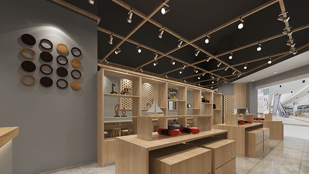 杭州定制珠寶店裝修設(shè)計,以“自然與匠心”為靈感,采用原木色、射燈與裸頂噴黑的組合,打造一個溫暖而富有藝術(shù)感的珠寶定制殿堂。