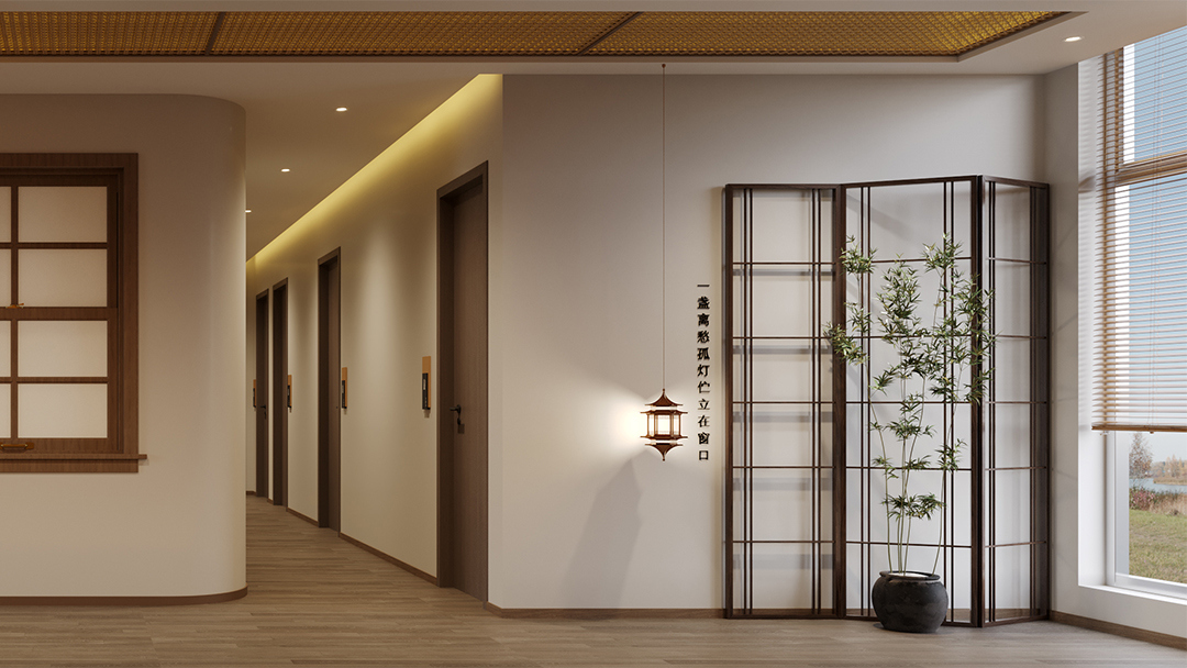 采用原木、竹編、素水泥等天然材質(zhì),搭配啞光金屬收邊條提升細節(jié)質(zhì)感;通過透光云石、鏤空屏風與智能調(diào)光系統(tǒng),營造“虛實相生”的靜謐氛圍。 - 空間功能的禪意表達