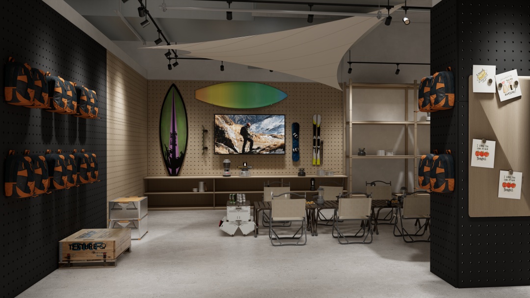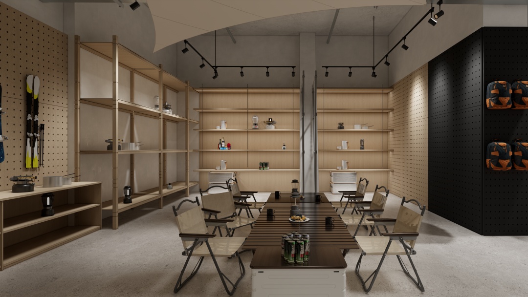 - 功能分區(qū)優(yōu)化:設(shè)置動(dòng)態(tài)展示區(qū)與靜態(tài)試衣間,通過(guò)高低錯(cuò)落平臺(tái)劃分區(qū)域,既保證顧客探索動(dòng)線(xiàn)的流暢性,又滿(mǎn)足裝備試用的專(zhuān)業(yè)需求;
