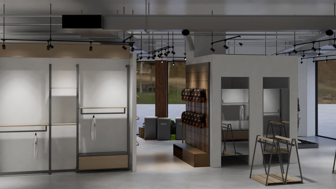 - 功能分區(qū)優(yōu)化:設(shè)置動態(tài)展示區(qū)與靜態(tài)試衣間,通過高低錯落平臺劃分區(qū)域,既保證顧客探索動線的流暢性,又滿足裝備試用的專業(yè)需求;